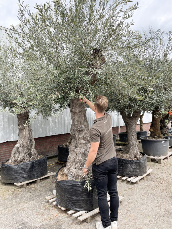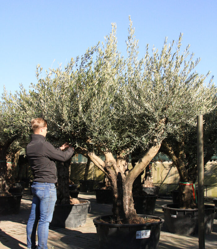 Een Branched olijfboom vraagt meer ruimte dan zijn enkelstammige soortgenoot. Voor een optimale groei is een plantafstand van minimaal twee tot drie meter vanaf muren of schuttingen aan te raden. De kroon kan uitgroeien tot een breedte van twee tot tweeënhalve meter, afhankelijk van het formaat. Zorg voor voldoende doorwortelbare ruimte in de grond voor een gezonde ontwikkeling van het wortelgestel.