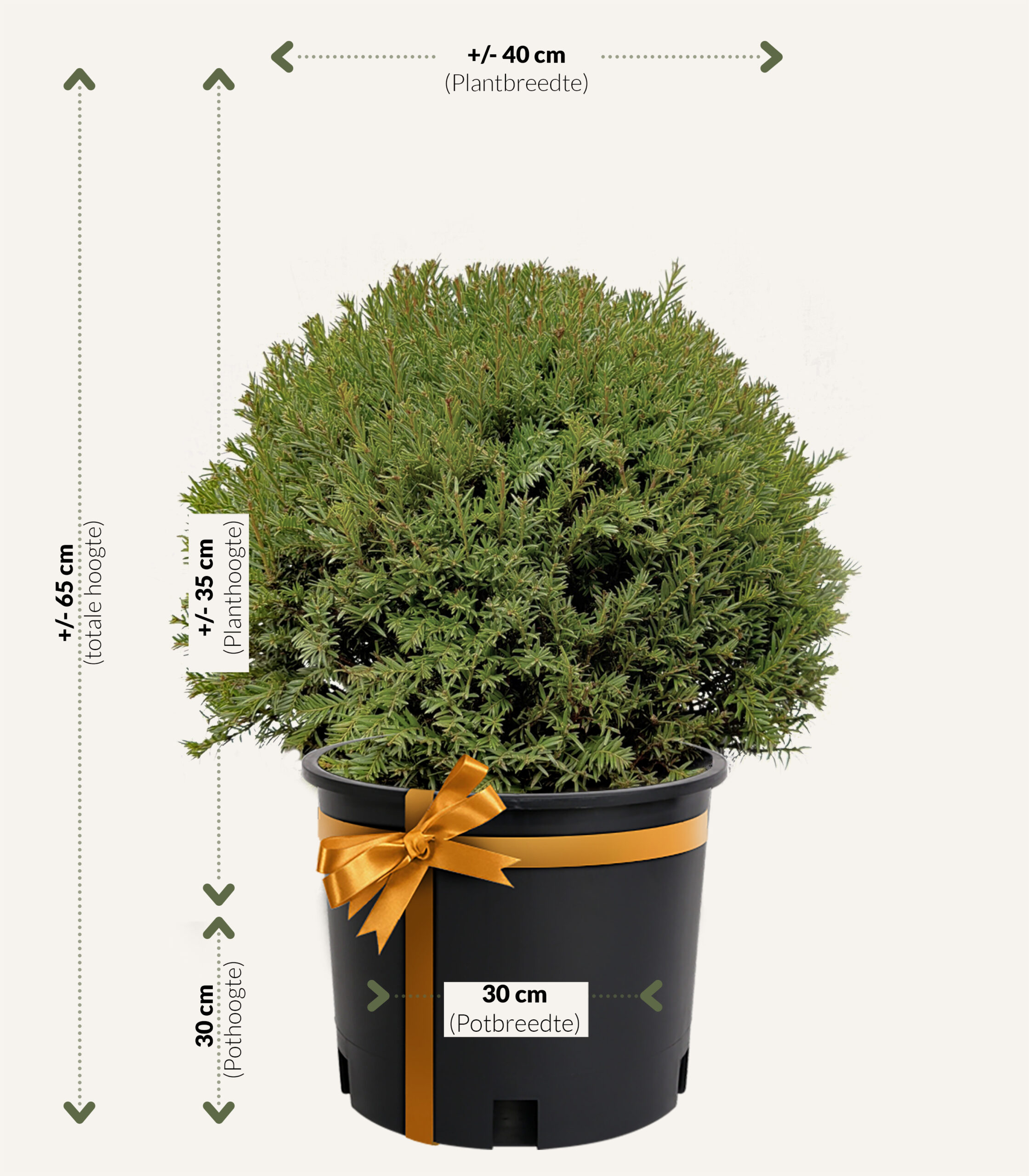 Deze klassieke conifeer staat bekend om zijn diepgroene naalden en dichte groei. Dankzij zijn strak gesnoeide bolvorm is deze plant perfect als stijlvolle blikvanger in de tuin, langs paden, op het terras of bij de entree. De Taxus blijft het hele jaar door groen, is zeer duurzaam en geschikt voor vrijwel elke tuin. Ideaal voor wie houdt van een nette en verzorgde uitstraling.