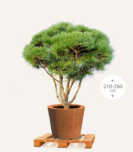 Deze bijzondere pijnboom staat bekend om zijn compacte groei, korte naalden en sterke uitstraling. De donkergroene naalden vormen een mooi contrast met de ruwe bast en geven de boom een natuurlijke, mediterrane uitstraling. Dankzij zijn karaktervolle vorm is deze den perfect als solitair in de tuin, in grote borders of als eyecatcher bij een terras.