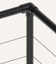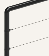 De leibomenstellage bestaat uit enkele zwarte stalen staanders, hoekelementen, bovenliggers, spandraad en draadspanners.