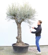 Deze oude productieboom krijgt na haar jaren trouwe dienst in de olijfboomgaard een nieuw leven in de Europese tuinen! Bij de snoei-methode ‘Bonsai’ wordt de gehele boom terug gezaagd tot één recht opgaande stam en slaat deze in één seizoen uit tot een ronde volle kroon.