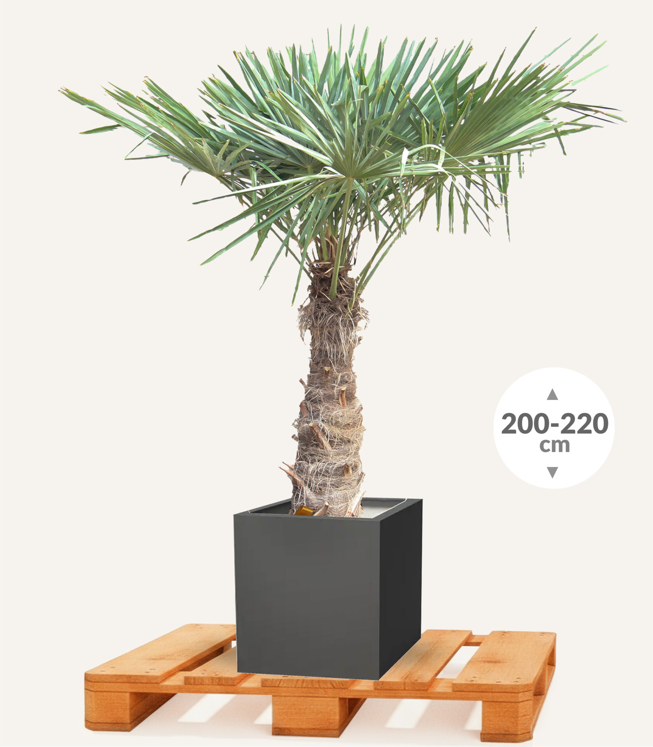 Al onze palmbomen zijn uiterst winterhard en kunnen een vorst verdragen van -10 tot -15 graden Celsius. Bij een uitzonderlijk koude winter kan het raadzaam zijn uw palmboom in te pakken met een van onze boomjassen.