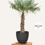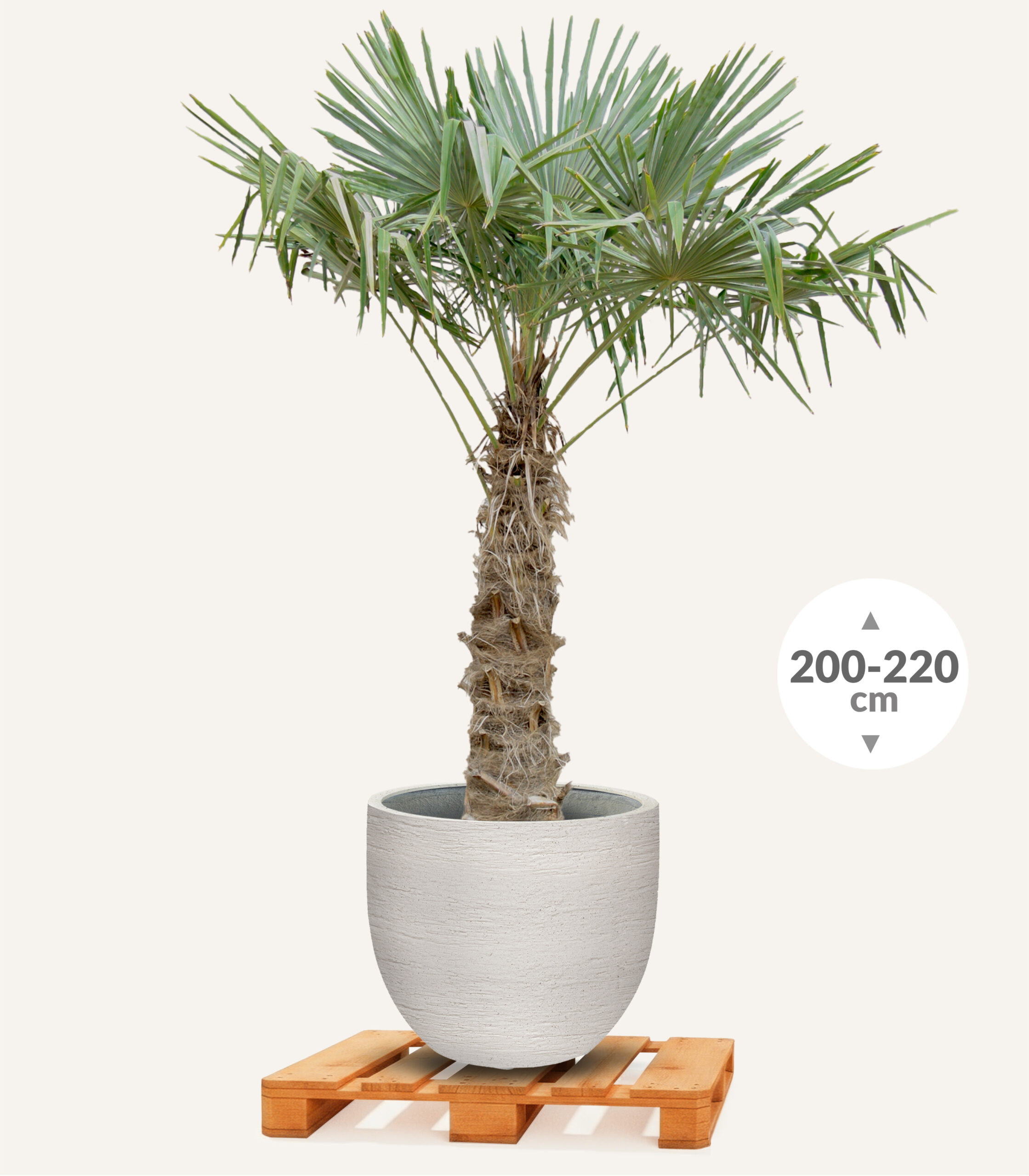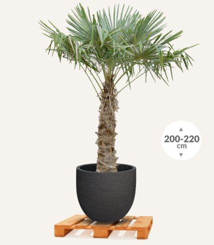 Palmboom 90/100 in ronde vlakke steenlook pot