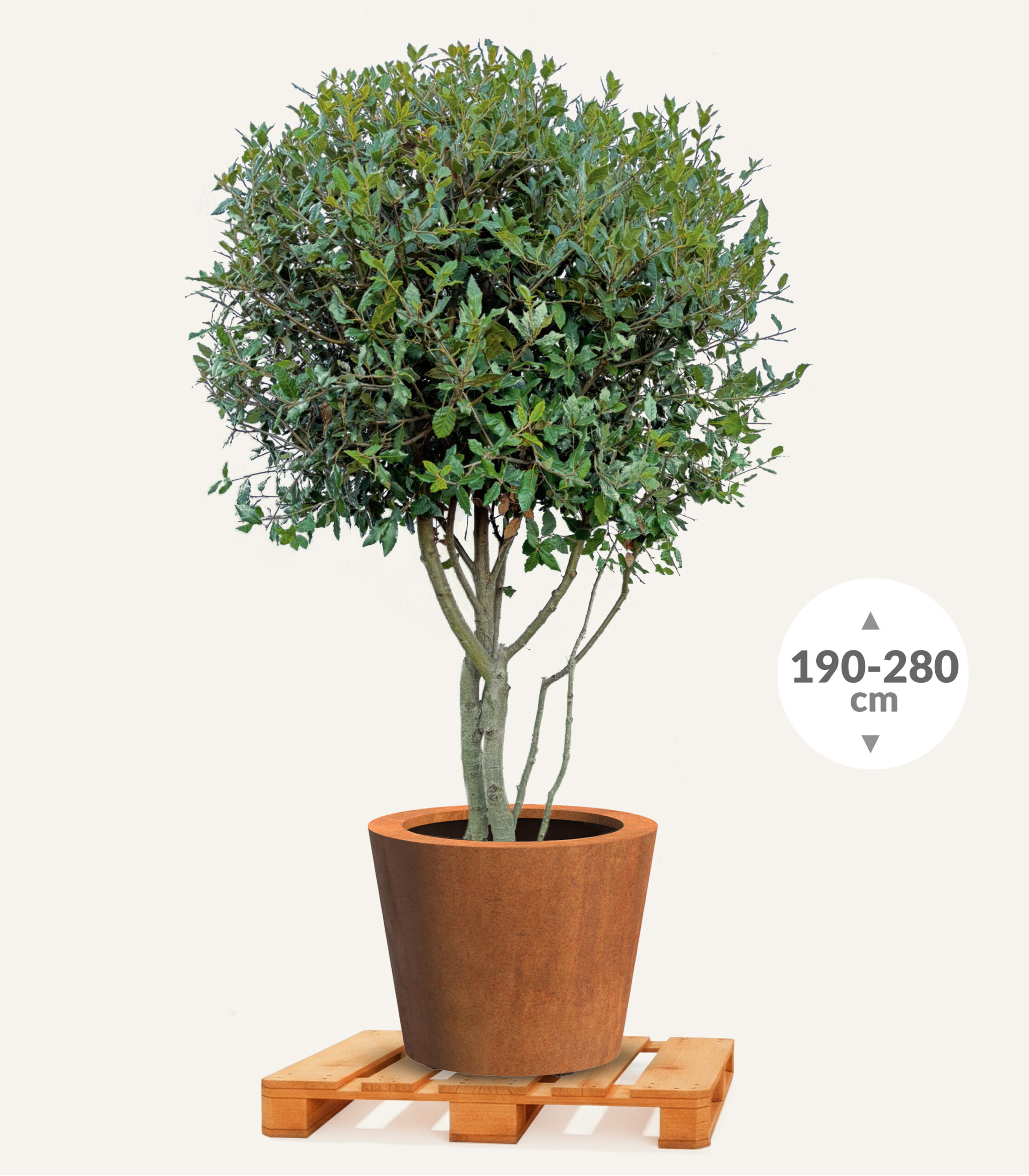 Een meerstammige Steeneik, kant&klaar, aangeplant in een van onze mooie sierpotten voorzien van de allerbeste aanplantgrond. Ideaal voor de ongeduldige groenfanaat: instant genieten.