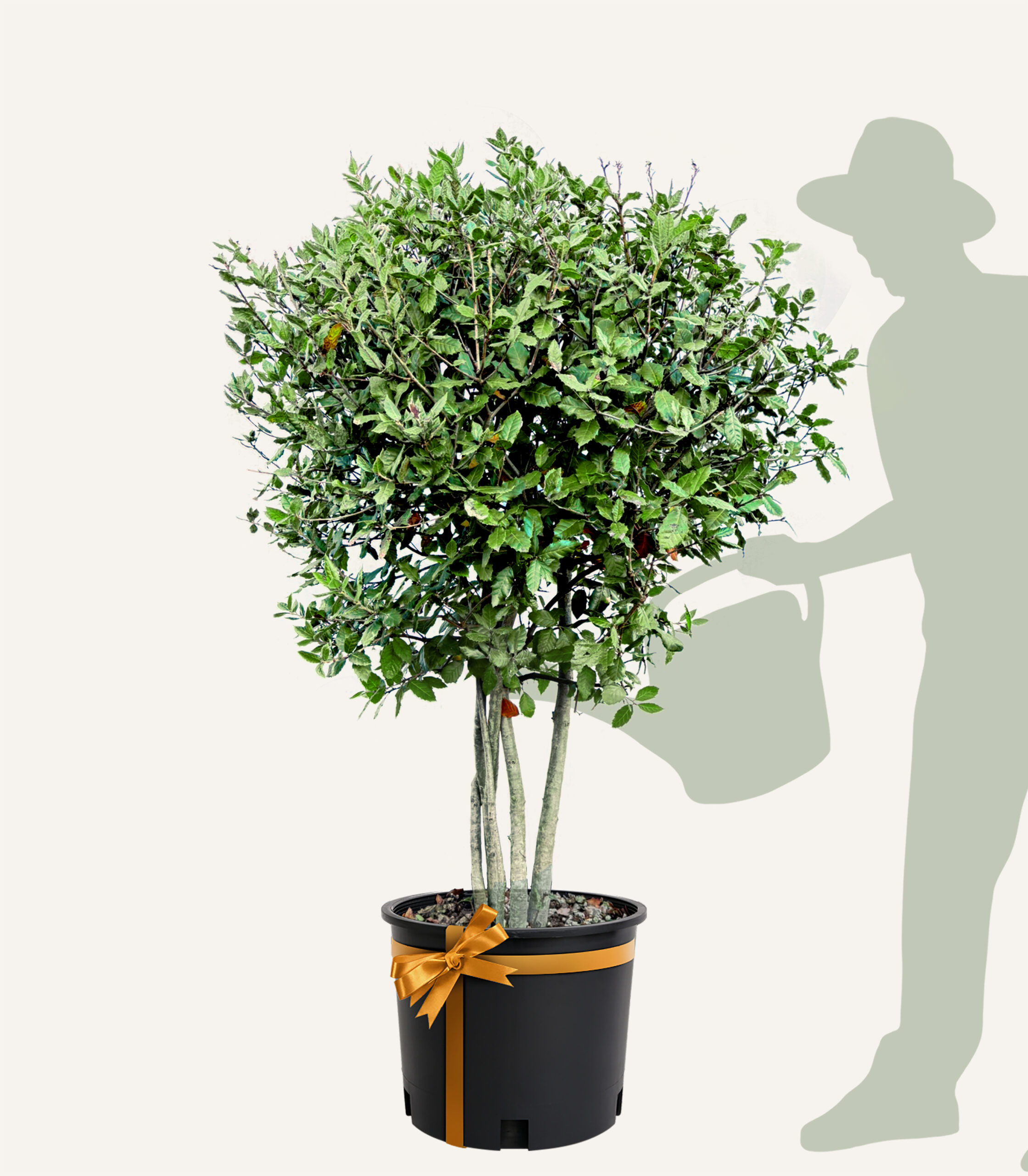 Deze karaktervolle, groenblijvende eik staat bekend om zijn leerachtige, donkergroene bladeren met een grijzige onderzijde en zijn krachtige uitstraling. In meerstammige vorm krijgt de boom een natuurlijke, sculpturale uitstraling die perfect past in zowel moderne als klassieke tuinen. Dankzij zijn sterke karakter is de steeneik zeer geschikt als solitair, bij een entree, op een terras of in een grote pot.